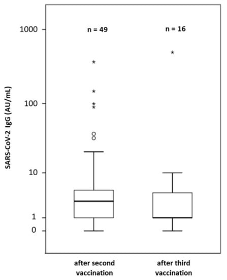 Sixteen of 47 (34%) patients opted for a third dose. This was performed with the same vaccine as the initial doses at least four months after the last OCR or RTX. Three patients (19%) received the mRNA-1273 and 13 patients (81%) the BNT162b2 vaccine. The median time between the last infusion of OCR or RTX and the third vaccination was 22.9 weeks (range 15.1 to 31.3). The median time between the second and the third vaccination was 14.9 weeks (range 6.6 to 30.1). The right-hand side of Table 1 shows the demographical data of all patients and lymphocyte counts at the time point of antibody testing. The median lymphocyte count at the time point of third vaccination was 1.4 G/L (range 0.9–2.8, normal value 0.8–4 G/L). None of the patients had lymphopenia. Data from Fluorescence Activated Cell Sorting (FACS) to assess B lymphocyte counts at the time point of third vaccination were available in seven patients. All but one patient had effective B cell depletion and had no detectable peripheral blood B cells. This patient was the only one out of 16 (6%) patients who seroconverted after the third dose (Figure 1): this was a 30-year-old male with RRMS (EDSS: 3.0, disease duration 4.4 years, and OCR treatment for 20 months at the time of third vaccination, time between second and third vaccination: 19 weeks). His lymphocyte count was 1.3 (normal value 0.8–4 G/L) at the timepoint of third vaccination and FACS revealed a B lymphocyte count of 132/µL (normal value: 80–616/µL). He increased his antibody titer from 3 AU/mL to 493 AU/mL 4.2 weeks after the third dose. The first antibody test took place 18 weeks after the second vaccination, whereas the second antibody test took place 4 weeks after the third vaccination.