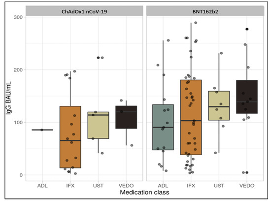 - Kennedy, N.A.; Lin, S.; Goodhand, J.R.; Chanchlani, N.; Hamilton, B.; Bewshea, C.; Nice, R.; Chee, D.; Cummings, J.F.; Fraser, A.; et al. Infliximab is associated with attenuated immunogenicity to BNT162b2 and ChAdOx1 nCoV-19 SARS-CoV-2 vaccines in patients with IBD. Gut 2021, 70, 1884–1893. [Google Scholar] [CrossRef] [PubMed]