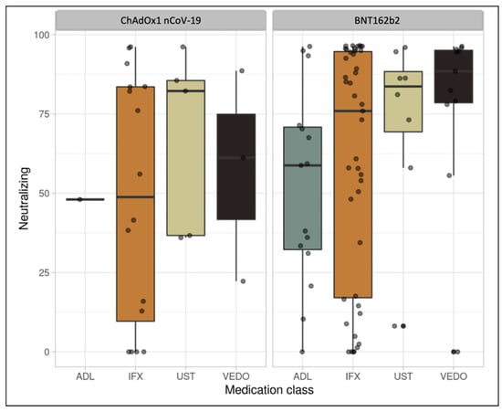 The median (IQR) anti-SARS-CoV-2 IgG level was 65 BAU/mL (14, 131) in patients who received two doses of the ChAdOx1 nCoV-19 vaccine and were treated with infliximab. The respective anti-SARS-CoV-2 IgG levels were 114 BAU/mL (69, 120) and 120 BAU/mL (88, 131) in patients treated with ustekinumab and vedolizumab. Median neutralizing antibody levels were 49 (10, 84) in patients treated with infliximab (Figure 2). Median neutralizing antibody levels in ustekinumab and vedolizumab users were 82 (37, 86) and 61 (42, 75), respectively (see Table 3). Finally, in patients who received one dose, the median (IQR) anti-SARS-CoV-2 IgG and neutralizing antibody levels were 60 (33, 151) and 34 (20, 93), respectively (See Table 4).