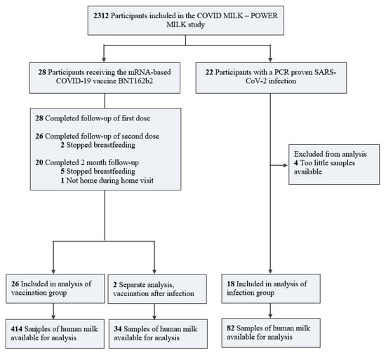 Human milk samples were collected from 46 lactating women, of whom 28 received the mRNA-based COVID-19 vaccine BNT162b2 and 18 had a prior PCR-confirmed SARS-CoV-2 infection (Figure 1).