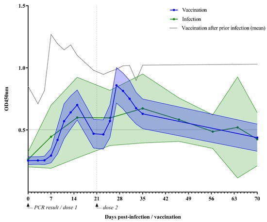 SARS-CoV-2-specific IgA levels following vaccination or infection. OD450 nm indicates optical density 450 nm. This figure shows specific IgA levels in human milk of lactating women over 70 days after vaccination with the mRNA-based COVID-19 vaccine BNT162b2 (n = 26) or a naturally acquired SARS-CoV-2 infection (n = 18). The solid dotted lines indicate mean IgA level in human milk following vaccination (blue) or infection (green); filled area between error lines indicates 95% confidence interval. The grey solid line indicates the mean IgA level in human milk following vaccination after prior infection (n = 2). The horizontal grey line at 0.502 represents the cutoff value for the detection limit of IgA in human milk.