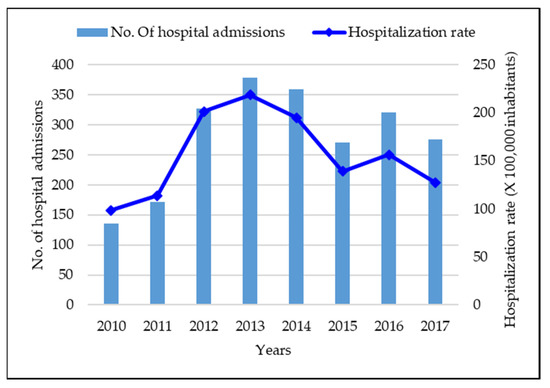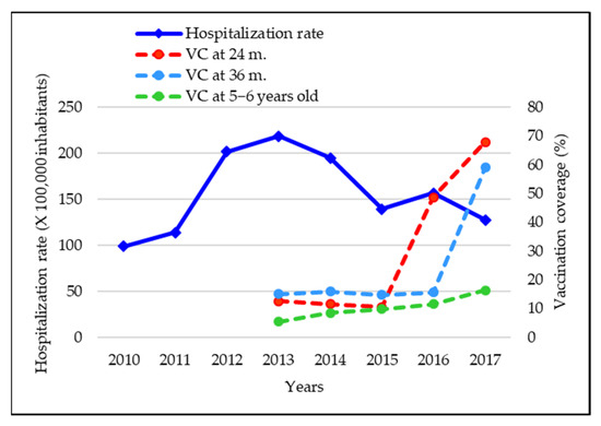 The vaccination coverages at 36 months and 5–6 years of age showed very low values in 2015 and 2016 and higher values starting from 2017, thus we did not consider these coverages associated with the declining trend of hospitalization rates in our study period. Two further clarifications need to be made considering the annual hospitalization rates (Figure 1). In fact, lower rates in 2010 and 2011 and a rebound in 2016 were observed.