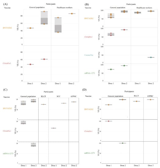 | Flacco et al./Italy [31] | Cohort study | 69,539/175,687 | ≥18 | BNT162b2, ChAdOx1, mRNA-1273 | Overall infection | 84% (80–87%) | ≥14 | 98% (97–99%) | B.1.1.7 | |