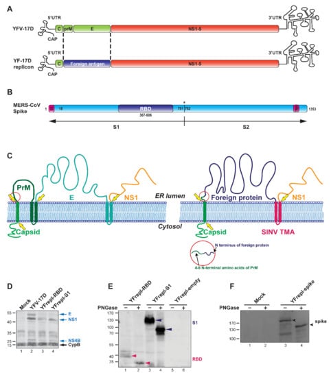 Design and characterization of YF-replicons expressing the RBD or S1 domain of the MERS-CoV S protein. (A) Schematic representation of the YFV genome and that of a YF replicon, in which the sequences encoding the glycoproteins prM and E are replaced by a sequence encoding a foreign protein. (B) Schematic representation of the MERS-CoV spike protein and its subdomains; SS—signal sequence; TMA—transmembrane anchor. Cleavage site between S1 and S2 is illustrated with an asterisk. (C) Cartoon showing the membrane topology of the YFV (left panel) and YF replicon (right panel) polyprotein. The yellow arrows indicate cleavage sites in the viral/replicon polyprotein. The bars that traverse the membrane represent the transmembrane anchors (TMA) of the N-terminally located protein. The red circle highlights the prM amino acid sequence retained at the site of the luminal cleavage that releases the N-terminus of the foreign insert. (D) Western blot analysis confirming the expression and processing of YF-replicon polyproteins, as compared to YFV-17D, using a polyclonal serum against YFV. Arrows on the right indicate the viral proteins (blue) and the intracellular chaperon cyclophilin B (CypB), which was used as a loading control (black). (E,F) Western blot analysis of the expression and glycosylation status of the RBD (red arrow)/S1 (black arrow) domains (E) or the full-length S protein (F, black arrow), expressed from YF replicons as indicated. Treatment with PNGase revealed the expected glycosylated nature of each of these proteins.