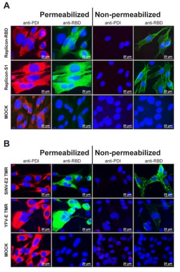 Immunofluorescent images of cells containing YF-replicons that express domains of the MERS-CoV S protein. Cells were either permeabilized with Triton X-100 for intracellular staining or left untreated for surface staining. (A) Surface and intracellular expression of the foreign domains RBD or S1. Cells were costained for protein disulfide isomerase (PDI) and MERS-CoV spike RBD. (B) Surface and intracellular expression of the RBD domain of MERS-CoV spike protein fused to either the SINV E2 TMR or the authentic YFV-E TMR in cells. Cells were costained for PDI. (A,B) PDI is stained red and RBD, green, and cell nuclei are visualized with DAPI staining (blue). A 63× objective (with immersion) was used to obtain the images.
