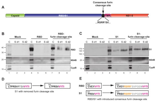 A highly important feature for a vector platform is its capability to incorporate and express diverse foreign inserts. Additionally, the immune response can be fine-tuned by presenting the foreign antigens in either cell-associated or secreted form. These features would potentially equip the platform for use against different pathogens. As a proof of concept for secreted antigen production, we aimed to generate secreted version of the MERS-CoV RBD and S1 domains in addition to products that were anchored to the plasma membrane. To that end, a consensus furin cleavage site [55] was introduced at the C-terminus of both domains, immediately upstream of the TMR (Figure 3A,E). Furin is a ubiquitous proprotein convertase that cleaves precursor proteins along the cell’s secretory pathway [56]. Therefore, proteins with a furin cleavage site that is located in the ER lumen are subjected to furin cleavage. To test for the secretion of the two MERS-CoV S domains, cells were electroporated with in vitro transcribed YF-replicon RNA expressing the RBD or S1 domain with or without an added furin cleavage site. Lysates from cell fractions and supernatants were harvested at day 1 or 2 posttransfection and probed for the presence of the RBD or S1 domains. The TMR-anchored RBD was found exclusively in the cellular fraction, while the RBD from the construct containing the furin cleavage site was also detected in the supernatant (Figure 3B). Unexpectedly, the S1 domain was found to be secreted in the case of both the TMR-anchored protein and the protein containing the engineered furin cleavage site. However, furin cleavage did enhance S1 secretion, which was clearly visible when samples taken at day 1 posttransfection were compared (Figure 3C, lanes 5 and 8). There was a natural furin cleavage site (PRSVR↓S) between the S1 and S2 domains of the MERS-CoV S protein, but that site was removed in the construct expressing the TMA-anchored S1 (Figure 3D), and an in silico prediction (ProP 1.0 server online) suggested its successful elimination. Currently, the mechanism of cleavage of the TMR-anchored form of S1, resulting in its (partial) secretion, is unclear.