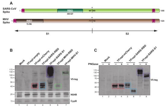 To further elucidate the capacity of the YF-replicon vector to incorporate and express foreign proteins, we constructed replicons expressing the RBD and S1 domains from two other coronaviruses—MHV and SARS-CoV (Figure 4A). To facilitate detection of the expressed proteins, two consecutive V5 tags were fused to the N-terminus of each insert. A replicon expressing a reporter gene (mCherry) was also constructed. The mCherry protein was tagged in an identical manner as the MHV and SARS-CoV domains, and its expression was confirmed using a fluorescence microscope (data not shown). All heterologous expression products were detected in lysates from cells containing the respective YF-replicons, as presented in Figure 4B. Notably, both MHV RBD and S1 were expressed at much lower levels than SARS-CoV RBD and S1 and mCherry. The expression of the MHV-derived domains was consistently low in multiple experiments, even in sample lysates normalized for the percentage of replicon-positive cells. Lastly, the N-linked glycosylation status of the RBD and S1 domains of SARS-CoV was investigated by treating transfected cell lysates with PNGase. This resulted in the generation of discrete, faster-migrating bands upon SDS–PAGE as compared to those of the nontreated samples (Figure 4C). The PNGase treatment did not influence the migration of the mCherry bands, which was expected (NetNGly 1.0 server [57]).