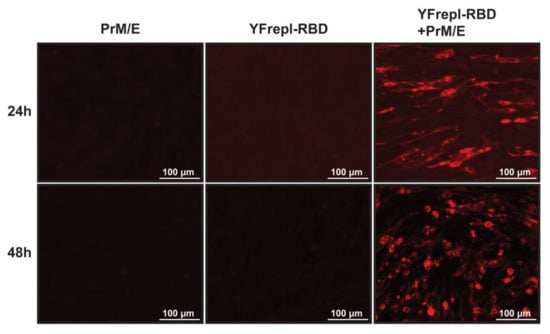 Expression of MERS-CoV RBD, following infection with replicon particles. Supernatants from BHK-21cells that were electroporated with either a plasmid encoding YFV prM/E, in vitro transcribed replicon RNA expressing the MERS-CoV RBD (YFrepl-RBD) or both, were harvested 24 or 48 h postelectroporation and used to infect fresh BHK-21 cells. After 24 h of incubation, the cells were fixated and analyzed by immunofluorescence microscopy. The RBD domain is stained in red. A 20× objective was used to obtain the images.