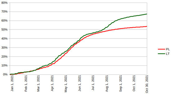 In view of the above, the aim of our study was to compare the effectiveness of vaccination programmes in two countries, Lithuania and Poland, measured by the respective percentages of the vaccinated population. The former state introduced a COVID-19 certificate domestically as a condition for participation in many everyday activities, while in the latter its possession did not entail any restrictions or benefits for the owner. Among the various possible strategies intended to lower infectivity, such as sero surveillance for COVID-19 antibodies, obligation to wear face masks in public, enforced social distancing or the use of COVID-19 certificates, we selected only the last one—the certificates with the accompanying restrictions.