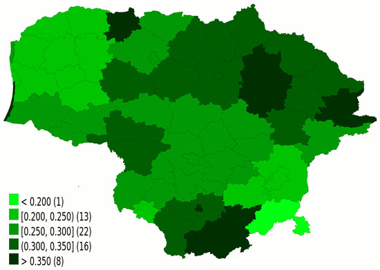 Disaggregated vaccination data for Poland were taken from the Ministry of Health of the Republic of Poland and the Ministry of Health of the Republic of Lithuania, while the number of inhabitants in particular age brackets was taken from the accompanying European Centre for Disease Prevention (ECDC) data to ensure consistency. The measured period was four months—from 30 June 2021 to 31 October 2021—as in that period, the difference between Lithuania and Poland in rates of vaccination with at least a single dose rose from 1.47 p.p. to 13.81 p.p. The impact had to be measured from the perspective of actually achieving a uniformly high vaccination rate over all former LAU1 sub-regions (380 “powiats” in Poland and 60 “savivaldybės” in Lithuania) for the purpose of achieving herd immunity.