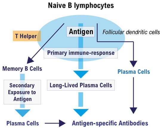 A naïve B cell present in the lymph nodes and spleen, when activated for the first time by the complementary T-dependent antigen, undergoes a series of modifications that occur essentially in the germinal center (GC) of the peripheral lymphoid organs (Figure 1). In the GC, T-helper lymphocytes, follicular dendritic cells (FDCs), and antigen-activated B lymphocytes are encountered, and together they produce a primary immune response. The primary humoral response produces plasma cells, memory B cells (MBCs) and long-lived plasma cells (LLPCs). LLPCs produce antigen-specific antibodies for a long time if they gain a bone marrow (BM) niche that hosts them, and have the task of preventing subsequent infection in the case of a new antigenic exposure. Conversely, in the secondary immune response, the MBCs that do not produce antibodies are activated but must first be transformed into plasma cells in order to do so, within a short period of time after contact with the specific antigen. This is why a vaccinated people who cannot develop LLPCs can become infected despite having a humoral immunological memory from MBCs.