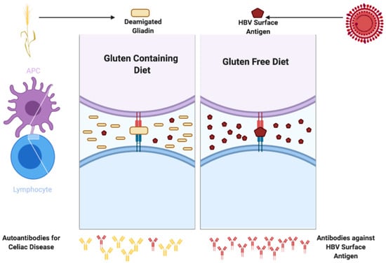 A possible mechanism through which the immune system may focus on the non-self antigen presented most commonly in these patients (dietary gluten) and may polarize its activity in this direction, rather than towards the hepatitis B (HBV) surface antigen, with massive production of TGA-IgA autoantibodies but suboptimal production of antibodies against the HBV surface antigens. (Figure created with Biorender).