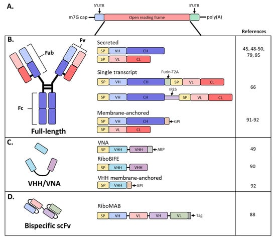 Schematic diagram of mRNA and antibody designs used in recent studies. (A) Basic structure of an mRNA construct; (B) different formats used by recent studies to encode a full-length antibody as mRNA; (C) derivatives of full-sized antibodies that are comprised of only the heavy chain; (D) bispecific antibody, single-chain variable fragment (scFv) format; SP, signal peptide; VH, variable heavy chain domain; CH, constant heavy chain domain; VL, variable light chain domain; CL, constant light chain domain; Furin-T2A, furin and thosea asigna virus 2A peptide; IRES, internal ribosomal entry site; GPI, glycosylphosphatidylinositol membrane anchor; VHH, VH domain, heavy chain only.