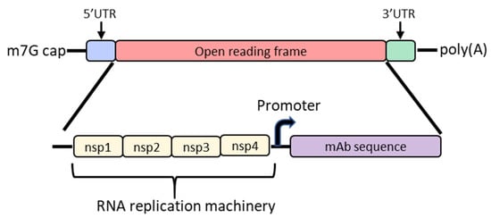 Diagram of the basic structure of self-amplifying mRNA (RepRNA) that includes the typical cap, 5′ and 3′ UTRs and poly(A) tail. The details of the open reading frame are depicted and contain the nsp1, nsp2, nsp3 and nsp4 genes from the alphavirus genome that encode for RNA replication machinery. Downstream from the rep genes are a subgenomic promoter and the elements encoding a monoclonal antibody (mAb). Abbreviations: m7G: 7-methylguanosine; UTR: untranslated region; nsp: nonstructural protein.