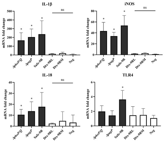 We knocked out target genes (phoP/Q, lpxL, lpxM, and pagP) by replacing the antibiotic resistance gene and the amplicons of target genes of Safe-9R; as a result, the knockout strains were the same in size (Figure 1B). The toxic effects of the knockout strains were compared using reverse transcription quantitative PCR of IL-1β, IL-18, TNF-α, iNOS, and TLR-4 mRNAs. The mRNA levels of TNF-α were not significantly different between the knockout strain-infected HD-11 cells and uninfected HD-11 cells. However, the IL-1β, IL-18, and iNOS mRNA levels of phoP/Q- and pagP-knockout strains, and Safe-9R were significantly higher than those of lpxL- and lpxM-knockout strains (named Dtx9RL and Dtx-9RM, respectively), and the negative control. Only Safe-9R showed significantly higher TLR-4 mRNA levels than the negative control (Figure 2). Therefore, live Dtx9RL and Dtx-9RM were successfully detoxified and did not induce the transcription of IL-1β, IL-18, iNOS, and TLR-4 genes.