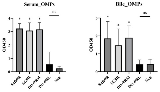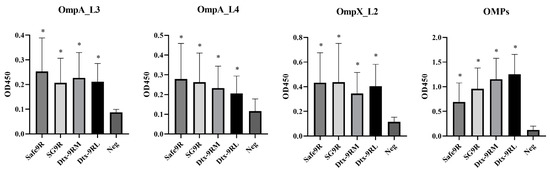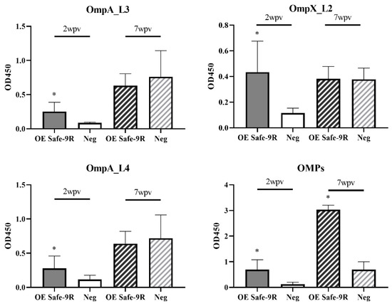 Humoral immune responses of the OE Safe-9R vaccines. Each group received OE Safe-9R at 1 week of age, and serum samples were collected at 2 weeks post-vaccination (wpv) and 7 wpv, respectively. The immune response was analyzed by ELISA made by Salmonella enterica serovar Gallinarum biovar Gallinarum (SG) immunogenic outermembrane proteins (OMP), OmpA and OmpX, and total OMP extracts. * Indicates a significant difference compared with Neg (p < 0.05).