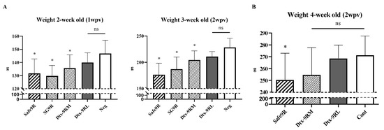 In vivo verification of detoxification by chick body weight model. Inactivated vaccines were inoculated in (A) 1 week-old and (B) 2 week-old chicks and the differences in body weight were examined. The significance was compared to the negative control. Statistical significance indicated as follows: ns not significant, * significantly different compared with Neg (p < 0.05).