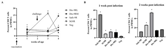 The humoral and mucosal antibody levels were compared, and Dtx-9RM-, Safe-9R-, and SG9R- vaccinated groups showed significantly higher levels than those of the negative control, but Dtx-9RL-vaccinated groups did not exhibit such levels (Figure 6). Dtx-9RL- and Dtx-9RM-vaccinated groups showed a significantly higher percentage of CD8+ T cells in PBMCs collected at 1 wpv compared to those observed in the negative control. Safe-9R-vaccinated, and Dtx-9RM- and SG9R-vaccinated groups showed significantly higher percentages of CD8+ T cells than those of the negative group at 1week post-challenge (wpc) and 2 wpc, respectively (Figure 7A). All of the vaccinated groups, and SG9R- and Dtx-9RM-vaccinated groups showed a significantly higher percentage of CD4+ T cells than the negative control group at 1 wpc and 2 wpc, respectively (Figure 7B).