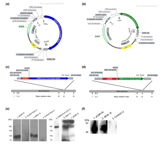Figure 1. Design of SARS-CoV-2 vector vaccine constructs expressing S and N proteins. (a) Gene map of pCMV plasmid expressing Truncated S (TrS) protein. (b) Gene map of pCMV plasmid backbone expressing N protein. (c) MVA vaccine construct expressing TrS protein with the addition of C-terminal 6X His tag. (d) The MVA construct expressing N protein. All gene maps were generated using Snapgene software. (e) Western blot analysis with anti 6xHis-HRP antibody (left) and polyclonal mouse anti-SARS-CoV-2 spike sera (right) confirming expression of S protein from vaccine constructs. Lanes are as follows: Supernatant (lanes 2) HEK 293T cells transfected with control plasmid, supernatant (lanes 1 and 7) HEK 293T cells transfected with pCMV-TrS plasmid. Supernatant (lanes 3 and 6) from chicken embryonic fibroblast (CEF) cells infected with MVA-TrS and control non-infected supernatant (lane 4). Purified recombinant SARS-CoV-2 S Glycoprotein (BEI resources-NR-52396). (f) Western blot analysis with anti 6xHis-HRP antibody N from vaccine constructs. Lanes are as follows: Cell pellet (lane 3) HEK 293T cells transfected with control plasmid, cell pellet (lane 1) HEK 293T cells transfected with pCMV-N plasmid. Cell pellet (lane 2) from CEF cells infected with MVA-N.