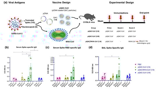 Currently, most experimental DNA vaccines are only amenable for intramuscular administration limiting mucosal immunity critically needed to reduce viral infection. Furthermore, the recently approved nucleic acid vaccines for COVID-19 are also administered parenterally []. Previously, we had shown that a 2-dose QAC encapsulated plasmid DNA (pQAC) encoding the nucleocapsid gene against avian coronavirus provided equal protection to live-attenuated vaccines when birds were challenged with Infectious Bronchitis Virus []. Although comparable, only T-cell responses were observed without a complementing humoral response in birds vaccinated with pQAC. In this report, we hypothesized that a heterologous strategy with QAC encapsulated plasmid DNA (pQAC) prime, followed by an MVA boost, would elicit a broader immune response. Both the pQAC plasmids (pQAC-CoV) and MVA vector (MVA-CoV) were designed to express S and N antigens encoded by SARS-CoV-2 from the early phase of the COVID-19 pandemic. The prime/boost (P/B) of vector vaccines were delivered via the intranasal route (I.N) and hereafter referred to as either pQAC/MVA-CoV or heterologous vaccine. Our results indicated that the I.N immunization with pQAC/MVA-CoV-induced systemic and local neutralizing antibodies in mice. Humoral responses were also complemented by the induction of localized Th17 cellular responses. Moreover, mice vaccinated with only plasmid vectors (pQAC-CoV) via the I.N or intramuscular route (I.M) generated significant type 1 and type 17 (Tc17 or Th17) cellular responses.