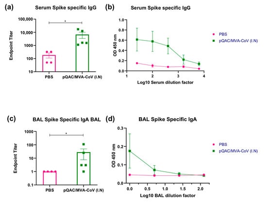 Figure 3. Heterologous vaccine strategy elicits spike-binding antibody responses. Groups of C57BL/5 mice were either unvaccinated (PBS) or immunized with pQAC/MVA-CoV (I.N). Serum and BAL samples were collected 3 weeks post boost. (a) SARS-CoV-2 spike-specific serum IgG binding endpoint titers measured by ELISA. (b) Serial serum dilutions of IgG binding to SARS-CoV-2 spike protein. (c) SARS-CoV-2 spike-specific BAL IgA binding endpoint titers measured by ELISA. (d) Serial BAL dilutions of IgA binding to SARS-CoV-2 spike protein. Significance (*, p < 0.05) was determined by one-way ANOVA. Data show mean ± SEM.