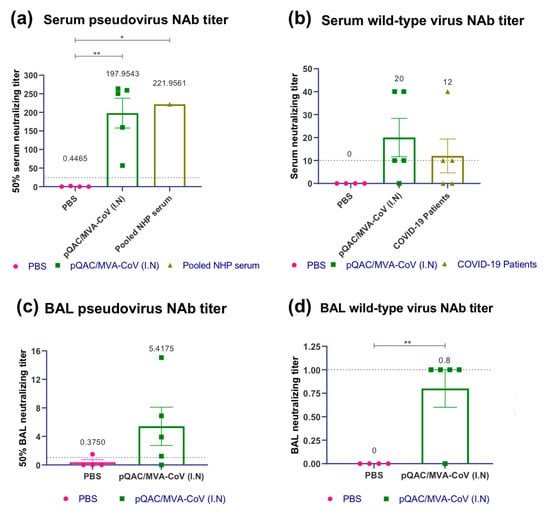 Figure 4. Heterologous vaccine strategy elicits SARS-CoV-2 neutralizing antibody responses. Groups of C57BL/5 mice were either unvaccinated (PBS) or immunized with pQAC/MVA-CoV (I.N). Serum and BAL samples were collected 3 weeks post boost. (a) 50% serum neutralization titer of pseudo-virus expressing SARS-CoV-2 spike, (b) serum neutralization titer of wild-type SARS-CoV-2, isolate USA-WA1/2020, (c) 50% BAL neutralization titer of pseudo-virus expressing SARS-CoV-2 spike, and (d) BAL neutralization titer of wild-type SARS-CoV-2, isolate USA-WA1/2020. Significance (*, p < 0.05; **, p < 0.01) was determined by one-way ANOVA. Data show mean ± SEM. The dotted line indicates the lower limit of detection.