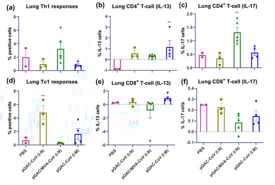 Figure 5. SARS-CoV-2 spike specific T cell responses in lungs of vaccinated C57BL/6 mice. Intracellular cytokine staining was performed on lungs harvested 3 weeks after final boost to assess T-cell responses. (a) Type 1 helper (Th1) responses (IFN-γ or TNFα or IL-2+), (b) type 2 helper (Th2) responses (IL-13+), (c) type 17 helper (Th17) responses (IL-17+), (d) type 1 cytotoxic (Tc1) responses (IFN-γ or TNFα or IL-2+), (e) type 2 cytotoxic (Tc2) responses (IL-13+), (f) type 17 cytotoxic (Tc17) responses (IL-17+) intracellular cytokine staining assays for lung T-cells in response to recombinant SARS-CoV-2 spike stimulation. Samples with lower live cells (<10,000) were excluded from analysis. Significance (**, p < 0.01) was determined by ANOVA compared to PBS controls. Data show mean ± SEM.