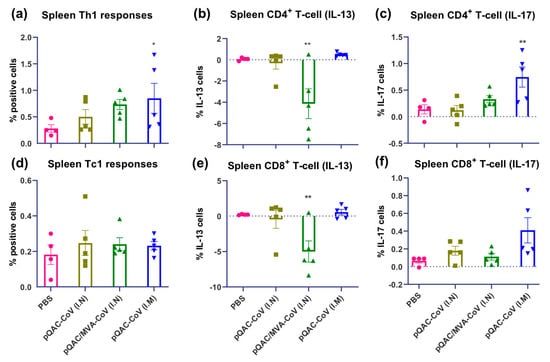 Figure 6. SARS-CoV-2 spike specific T cell responses in spleen of vaccinated C57BL/6 mice. Intracellular cytokine staining was performed on spleens harvested 3 weeks after final boost to assess T-cell responses. (a) Type 1 helper (Th1) responses (IFN-γ or TNFα or IL-2+), (b) type 2 helper (Th2) responses (IL-13+), (c) type 17 helper (Th17) responses (IL-17+), (d) type 1 cytotoxic (Tc1) responses (IFN-γ or TNFα or IL-2+), (e) type 2 cytotoxic (Tc2) responses (IL-13+), (f) type 17 cytotoxic (Tc17) responses (IL-17+) intracellular cytokine staining assays for spleen T-cells in response to recombinant SARS-CoV-2 spike stimulation. Significance (*, p < 0.05; **, p < 0.01) was determined by ANOVA compared to PBS controls. Data show mean ± SEM.