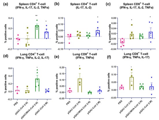 Figure 7. Immunization with SARS-CoV-2 vaccine constructs induces polyfunctional T cells. (a) CD4+ IFN-γ, TNFα, IL-2, and IL-17, (b) CD 4+ IL-2 and IL-17 (c) CD8+ IFN-γ, TNFα, IL-2, and IL-17 polyfunctional T-cells in the spleen of vaccinated mice. (d) CD4+ IFN-γ, TNFα, IL-2, and IL-17, (e) CD8+ IFN-γ and TNFα, (f) CD8+ IFN-γ, TNFα, and IL-17 polyfunctional T-cells in the lungs of vaccinated mice following intracellular cytokine staining assays for after recombinant SARS-CoV-2 spike stimulation. Significance (*, p < 0.05; **, p < 0.01) was determined by ANOVA compared to PBS controls. Data show mean ± SEM.