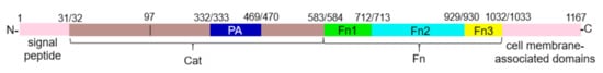 Structurally, ScpA is a multi-domain protein composed of 1167 amino acid residues in length and possesses an N-terminal 31-residue signal peptide, a catalytic domain (residues 32–583, Cat domain) with an inserted protease-associated subdomain (residues 333-469, PA domain), three tandemly arranged fibronectin domains (residues 584–712, Fn1; residues 713–929, Fn2; residues 930–1032, Fn3), and several cell membrane-associated domains (residues 1033–1167) at the C-terminus (Figure 1) [40]. Most ScpA proteins currently studied for GAS vaccine development are nearly full-length mutant forms [18,39]. To the best of our knowledge, however, immunological properties of the different domains of ScpA have not been reported yet. Thus, it is extraordinarily deserved to explore their immunogenicity so as to identify the more antigenic epitope for subunit protein vaccine development. In this study, we recombined the different segmented domains of ScpA and evaluated the detail immunological properties of these recombinant proteins in murine model.
