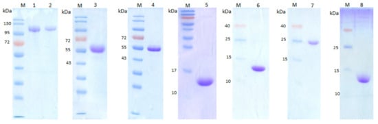 Using the primers listed in Table S1, rsScpA, rsScpA193, Cat, PA, Fn, Fn1, Fn2 and Fn3 genes were successfully cloned from the previously reported pGEX-6P-3 expression vectors that carried ScpA and ScpA193 genes (bases 96–3096) via conventional protocols [39,40]. After these genes were inserted into expression vector pGEX-6P-3 (for rsScpA, rsScpA193, PA, Fn, Fn1, Fn2 and Fn3 genes) and pET-21b (for Cat gene) by standard protocols, the recombinant plasmids were transferred into E. coli BL21(DE3) to express the corresponding proteins. The recombinant proteins were designed to contain a GST tag at the N-terminal or a hexa-histidine tag at the C-terminal. Therefore, rsScpA, rsScpA193, PA, Fn, Fn1, Fn2 and Fn3 proteins with GST tags were purified by GSTrap affinity column, while Cat protein, which contained a hexa-histidine tag, was purified by Ni+ affinity column. The SDS-PAGE results depicted in Figure 2 showed the purity and homogeneity of the purified recombinant target proteins. The detected bands of rsScpA (~103 kDa), rsScpA193 (~103 kDa), Cat (~52.6 kDa), Fn (~50.3 kDa), PA (~15 kDa), Fn1 (~14.6 kDa), Fn2 (~24.1 kDa) and Fn3 (~11.3 kDa) were consistent with the theoretically predicted molecular weights.