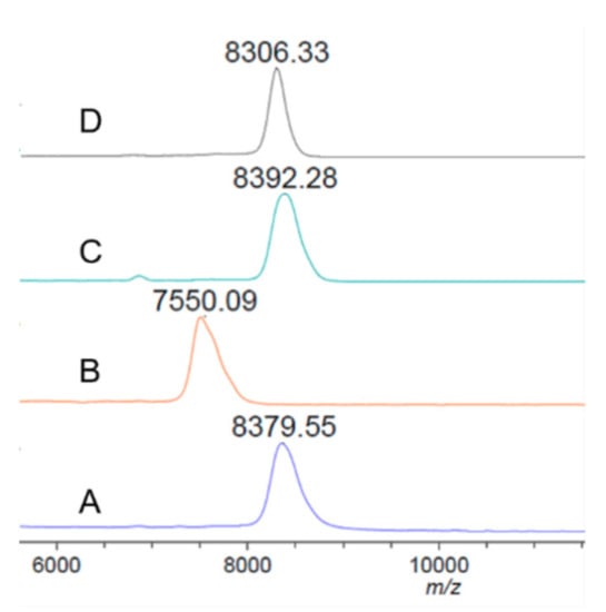 MALDI-TOF MS results for the enzymatic hydrolysis of (A) human C5a peptide (30 μg/mL) catalyzed by (B) rsScpA (1.0 μg/mL), (C) rsScpA193 (300 μg/mL) and (D) Cat (300 μg/mL) after incubation at 20 °C for 30 min.