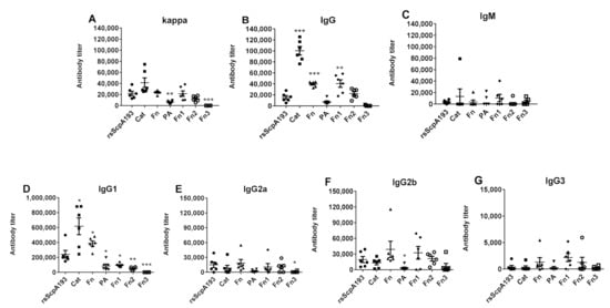 ELISA results of the corresponding protein-specific (A) total (anti-kappa), (B) total IgG, (C) IgM, (D) IgG1, (E) IgG2a, (F) IgG2b, and (G) Ig3 antibody titers in the pooled day 35 antisera are displayed. Each dot represents the result of an individual mouse immunized with rsScpA193 (●), Cat (■), Fn (▲), PA (▼), Fn1 (♦), Fn2 (○), and Fn3 (□), respectively; the black bars show the mean ± SEM values. *: significantly different (p < 0.05); **: very significantly different (p < 0.01); ***: extremely significantly different (p < 0.001) from the data of antiserum rsScpA193.