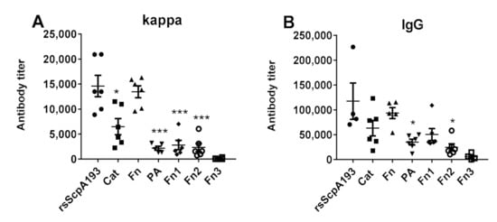 ELISA results of (A) total (anti-kappa) and (B) total IgG antibody titers in the pooled day 35 antisera detected with rsScpA protein as the capture antigen. Each dot represents the result of an individual mouse immunized with rsScpA193 (●), Cat (■), Fn (▲), PA (▼), Fn1 (♦), Fn2 (○), and Fn3 (□), respectively; the black bars show the mean ± SEM values. *: Significantly different (p < 0.05); ***: extremely significantly different (p < 0.001) from the data of antiserum rsScpA193.
