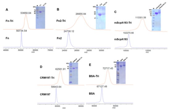 MALDI-TOF MS and SDS-PAGE results for (A) Fn and Fn-trisaccharide conjugate (Fn-Tri), (B) Fn2 and Fn2-trisaccharide conjugate (Fn2-Tri), (C) rsScpA193 and rsScpA193-trisaccharide conjugate (rsScpA-Tri), (D) CRM197 and CRM197-trisaccharide conjugate (CRM197-Tri) and (E) BSA and BSA-trisaccharide (BSA-Tri) conjugate.