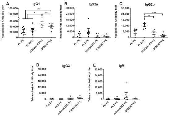 ELISA results showing the (A) IgG1, (B) IgG2a, (C) IgG2b, (D) IgG3 and (E) IgM antibody titers in the day 35 antisera of mice immunized with Fn-Tri (●), Fn2-Tri (■), rsScpA193-Tri (▲), and CRM197-Tri (▼), respectively, using BSA-Tri as the capture antigen. Each dot represents the result of an individual mouse, and the black bars show the mean ± SEM values. NS: Not statistically significant; *: significantly different (p < 0.05) **: very significantly different (p < 0.01); ***: extremely significantly different (p < 0.001).