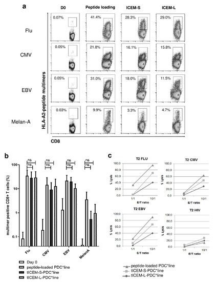 The transduction with memory/naïve polyepitope constructs induced multi-specific and functional T-cells. Peptide-loaded PDC*line cells or PDC*line cells transduced with memory/naïve polyepitopes were cocultured with peripheral blood mononuclear cells (PBMCs) from five healthy donors. Two ICEM polyepitope constructions were used differing by peptide length (S: short; L: long). ICEM indicates the order of HLA-A2-restricted peptides (influenza M1, CMV pp65, EBV-BMLF1, and Melan-A). Antigen-specific T-cell expansion was measured following a 14-day culture using HLA-A2/peptide multimer staining on CD3+ CD8+ cells. In (a), representative dot plots are shown, and (b) represents the results obtained following coculture with the five different donors. Values inside the dot plots indicate the percentage of specific T-cells. In (c), the functionality of expanded specific T-cells was evaluated and shown. Following expansion, specific T-cells were submitted to a 51Cr cytotoxic assay using peptide-loaded T2 target cells at two different effector/target ratios (1:1 and 10:1). Cytotoxicity against Flu, CMV, and EBV peptide-loaded T2 target cells was measured following 4 h of incubation. Human immunodeficiency virus (HIV) peptide-loaded cells were used as a negative control. Statistics are based on one-way ANOVA (nonparametric Friedman test with Dunn’s post hoc test; ns: nonsignificant).