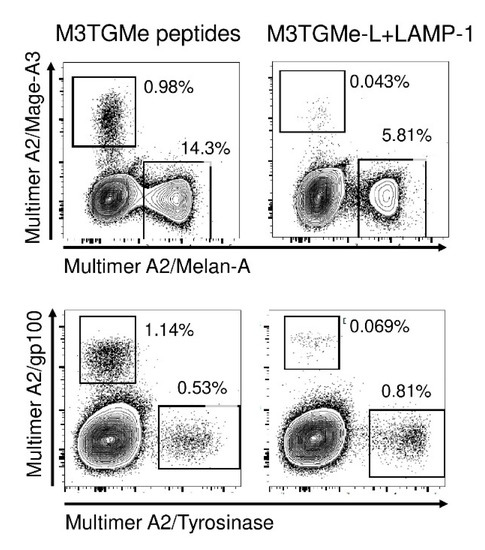 The following peptides were purchased from Polypeptide: Melan-A26–35 A27L (ELAGIGILTV), gp100209–217 (IMDQVPFSV), gp100471–480 (VPLDCVLYRY), tyrosinase 369–377 (YMDGTMSQV), Mage-A3271–279 (FLWGPRALV), influenza virus (Flu) M158–66 (GILGFVFTL), cytomegalovirus (CMV) pp65495–503 (NLVPMVATV), CMVpp65417–426 (TPRVTGGGAM), Epstein-Barr virus (EBV) BMLF1280–288 (GLCTLVAML), and Human Immunodeficiency virus (HIV) gag77–85 (SLYNTVATL).