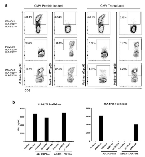 As PDC*line cells express naturally HLA-B*07:02, in addition to HLA-A*02:01, we asked if HLA-B7 was functional and if the cells could activate T-cells specific for A2- and B7-restricted antigens at the same time. The cells were transduced with the whole CMV pp65 protein that contains several immunogenic epitopes, including one presented in the context of HLA-A*02:01 (NLVPMVATV) and another one in the context of HLA-B*07:02 (TPRVTGGGAM). Transduced PDC*line cells were compared to peptide-loaded cells for their ability to expand peptide-specific T-cells in cocultures. We used PBMCs from three healthy donors, expressing HLA-A*02, HLA-B*07, or both molecules. As shown in Figure 5a, pp65-transduced PDC*line cells induced HLA-A*02- and/or HLA-B*07-specific CD8+ lymphocytes. This expansion is HLA-restricted, as antigen-specific T-cells were expanded only when there was a match between the HLA molecules expressed by the PBMCs and the PDC*line cells. Interestingly, T-cells responding to two epitopes were induced in PBMC#3, positive for both HLA-A*02 and HLA-B*07.