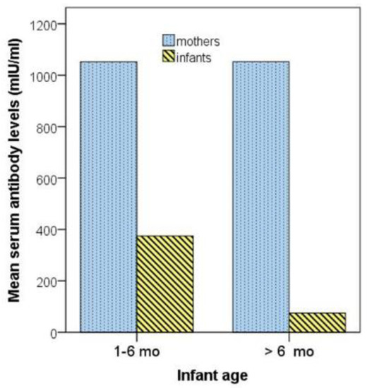 Serum measles antibody levels in two infant subgroups with age lower than 6 months and equal to/higher than 6 months, respectively, and their respective mothers are depicted in Figure 1.
