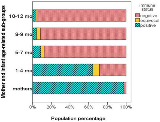 Percentages of mothers and infants of different age-related subgroups with protective (positive), equivocal, and non-protective (negative) measles antibody levels.