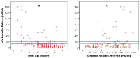 Scattergram of infant measles antibody levels plotted against infants’ age (A) and maternal antibody levels (B). The blue reference line represents the lower protective level (200 mIU/mL); the area between the blue and green reference lines represents the area of equivocal protective levels (150–200 mIU/mL).