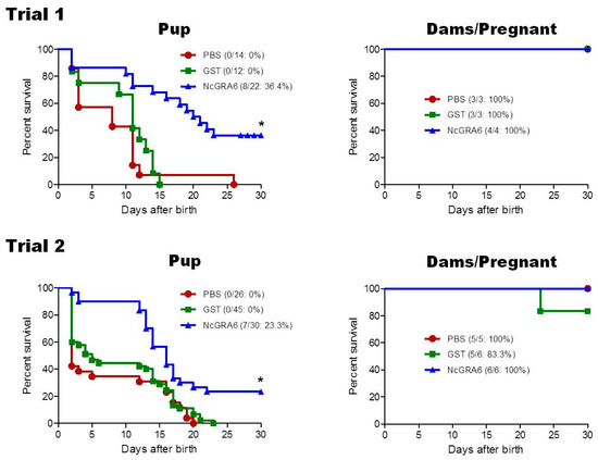 Table 1 shows the outcome of N. caninum infection in dams and offspring in both trials. Analyzing both trials, no significant difference in birth rate of pregnant dam was recorded in NcGRA6+GST-immunized mice (10/10; 100%) in comparison with those of PBS (7/8; 87.5%) and GST (8/9; 88.9%) groups (p = 0.249, NcGRA6+GST vs. PBS; p = 0.278, NcGRA6+GST vs. GST). The numbers of offspring per litter in the group receiving immunization with NcGRA6+GST (M ± SD; 5.2 ± 1.2) were not different from those in the group receiving PBS (5.7 ± 2.2) or GST (7.3 ± 1.3). Next, the survival rates of offspring were examined for 30 days after birth. The survival rate for the offspring from dams immunized with NcGRA6+GST (15/52; 28.8%) was significantly higher than those of PBS and GST groups (p < 0.0001), where all offspring were succumbed (PBS, 0/40; GST, 0/57) (Table 1 and Figure 1).