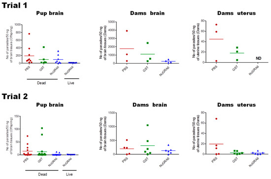 When analyzing trial 1 and trial 2 separately for survival rates of offspring, we found that the tendency showed similar effect concerning higher survivals of the NcGRA6 + GST-immunized group than control groups (trial 1: PBS: 0/14, GST: 0/12, NcGRA6+GST: 8/22 (36.4%); trial 2: PBS: 0/26, GST: 0/45, NcGRA6 + GST: 7/30 (23.3%)), with high levels of significance (trial 1: p = 0.0003, NcGRA6+GST vs. PBS; p = 0.0002, NcGRA6+GST vs. GST; trial 2: p = 0.0006, NcGRA6+GST vs. PBS; p = 0.0005, NcGRA6 + GST vs. GST). Regarding parasite burden, brain of offspring of immunized dams with NcGRA6 + GST showed the lowest parasite number in relation to other groups (PBS and GST), particularly in ones that survived, although the difference was not significant (p > 0.05) (Figure 2). This result suggests that immunization of mice with NcGRA6 induced partial reduction of vertical transmission of neosporosis in pregnant BALB/c mice.