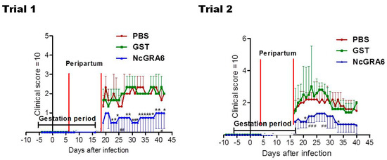 The clinical score observed in pregnant mice. Clinical scores were monitored daily until 30 days after delivery for all mice in each group. The average of all mice in each group was calculated as means ± SD of clinical score values of all mice in a group. The significance of (*) or (#) in the average clinical score was determined with two-way ANOVA plus Bonferroni post hoc analysis (p < 0.05) of NcGRA6+GST immunized groups against both PBS and GST groups or against PBS group only, respectively.