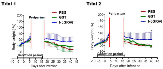 Moreover, lower alteration in body weight was reported in NcGRA6+GST-immunized groups in comparison with the controls (PBS or GST), although it was not a statistically significant difference (p > 0.05) (Figure 4). The average of each group also indicated the development of pregnancy and the stability of body weight in dams from NcGRA6+GST immunized mice in comparison with other groups (Figure 4). No differences were recorded among the PBS- and GST-inoculated mouse groups, either in clinical score or in the body weight (p > 0.05) (Figure 3 and Figure 4). These results indicated that immunization with the naked recombinant protein of NcGRA6 protected dams against N. caninum infection during pregnancy.