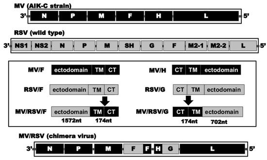 Construction strategy. Gene of the measles virus is shown in black and that of RSV in gray. The ectodomains of measles F and HA protein genomes were replaced with those of RSV F and G protein genomes. They were fused to the respective TM–CT region of the measles virus. The chimeric infectious cDNA (MV/RSV) was constructed and details are in Supplemental Figures S1 and S2.