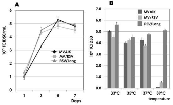 Virus growth of MVAIK, MV/RSV, and RSV/Long and comparison of virus growth at different temperatures. (A) Vero cells were infected with MVAIK, MV/RSV, and RSV/Long and culture fluids were harvested at 1, 3, 5, and 7 days after infection. Vertical lines show the mean ± error bar of three experiments. (B) Virus infectivity on day 5 of infection at different temperatures of 33, 35, 37, and 39 °C. Vertical columns show the infective virus titer of mean + error bar of three experiments.