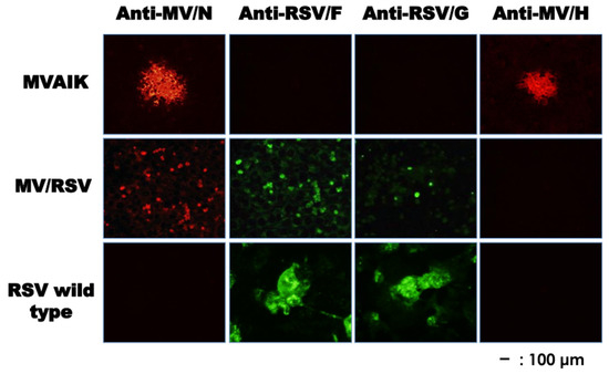 Vero cells were infected with MVAIK, MV/RSV, and RSV at m.o.i. of 0.1 in 24-well plates and cultured for three days at 33 °C. Vero cells were fixed with 1% glutaraldehyde for 30 min and subjected to indirect immunostaining. Infected cells were incubated with monoclonal antibodies against RSV G (HyTest, Turku, Finland) for 1 h at 37 °C. The cells were washed extensively with PBS (-) with 0.05% Tween 20 (PBST) and stained with a secondary antibody against anti-mouse IgG conjugated with FITC (Proteinteck, Rosemont, IL, USA). As for the detection of the RSV F protein, a monoclonal antibody against RSV F protein (Abcam, Cambridge, UK) and an anti-mouse IgG conjugated with FITC (Proteinteck, IL, USA) were used. Vero cells were also incubated with a mouse monoclonal antibody against MV HA protein (kindly supplied by Dr. Sato, National Institute of Infectious Diseases, Tokyo, Japan) and followed by a secondary antibody against mouse IgG conjugated with rhodamine raised in goat (Rockland Immunochemicals, Gilbertsville, PA, USA). The expression of measles N protein was stained with a monoclonal antibody against measles N protein (Abcam, Cambridge, UK) and a secondary antibody conjugated with Alexa Fluor 568 (Invitrogen, Carlsbad, CA, USA).