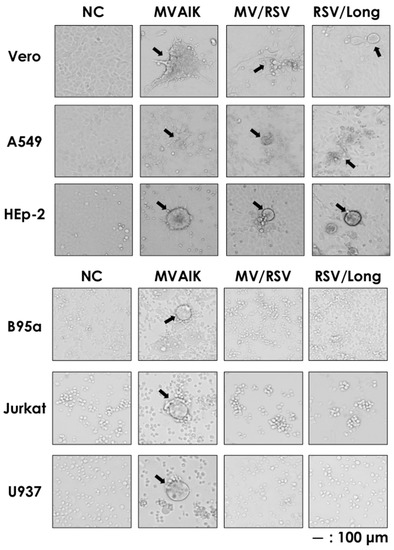 Appearance of CPEs in Vero, A 549, HEp-2, B95a, Jurkat, and U937 cells infected with MVAIK, MV/RSV, and RSV/Long. Vero, A 549, HEp-2, B95a, Jurkat, and U937 cells were infected with MVAIK, MV/RSV, and RSV. The cells were fixed and CPE was observed. Arrows indicate the appearance of cell fusion. Scale bar of 100 μm is shown.